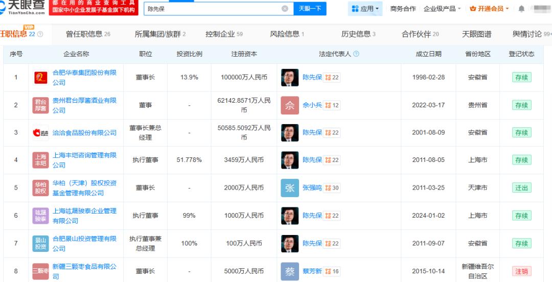 天眼查数据显示,截至目前,陈先保在合肥华泰集团股份有限公司、贵州君台厚酱酒业有限公司、洽洽食品等 7 家存续或迁出企业中担任高管。