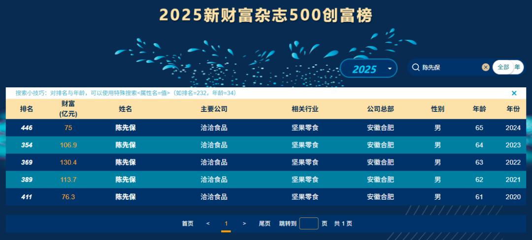 恰恰食品的业绩下滑,也拖累了公司创始人陈先保的财富表现。曾在 2012 年以 30 亿元财富问鼎安徽首富的陈先保,2025 年未能登上新财富杂志 500 创富榜。