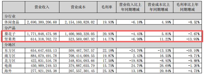 作为占总营收比重达 64.39% 的支柱业务,葵花子 2025 年上半年录得营收 17.72 亿元,同比下降 4.45%,毛利率同比下降 7.67% 至 20.93%。