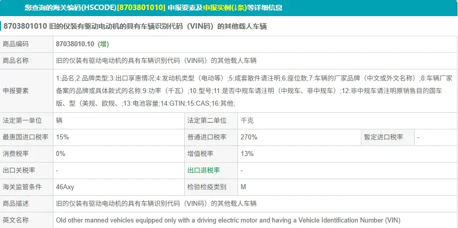 脖子哥翻阅了具体的海关编码,这次新增了具有识别代码的纯电车 (编码:87038010.90)这一类目,与原来二手纯电车 (编码:87038010.10)并不一样。