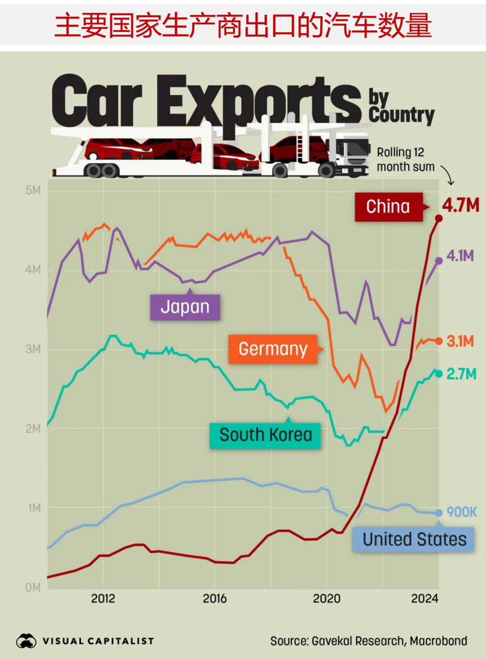 从 2021 年的 200 万辆,一路狂飙,到 2024 年直接干到了 500 多万辆,硬生生把日本拽下马,成了全球第一。其中,新能源车贡献了五分之一,可谓功不可没。