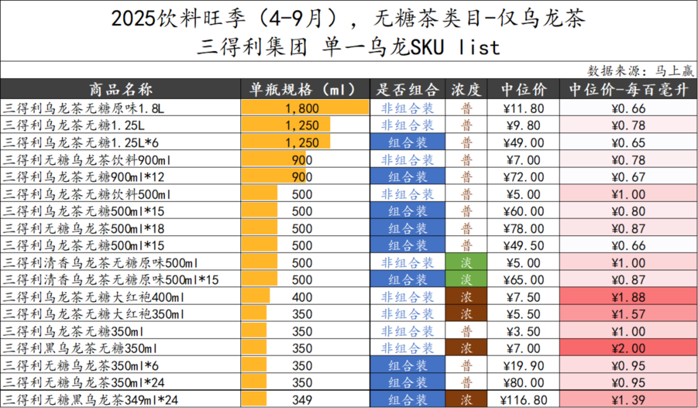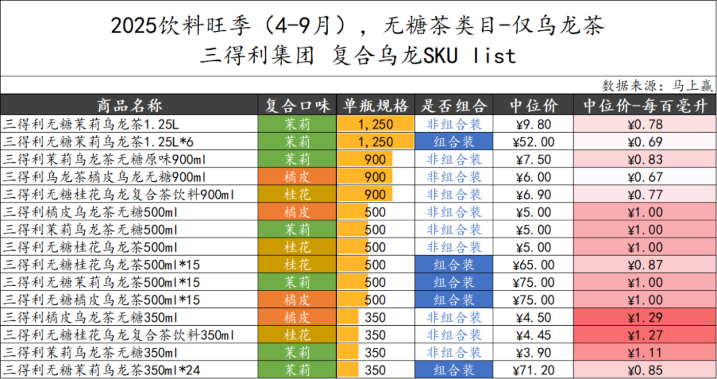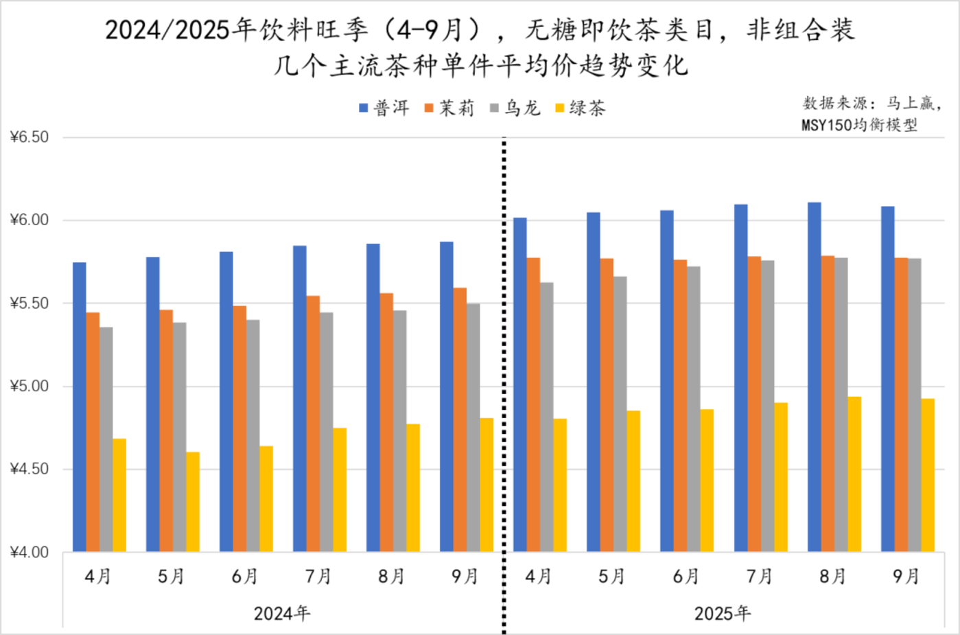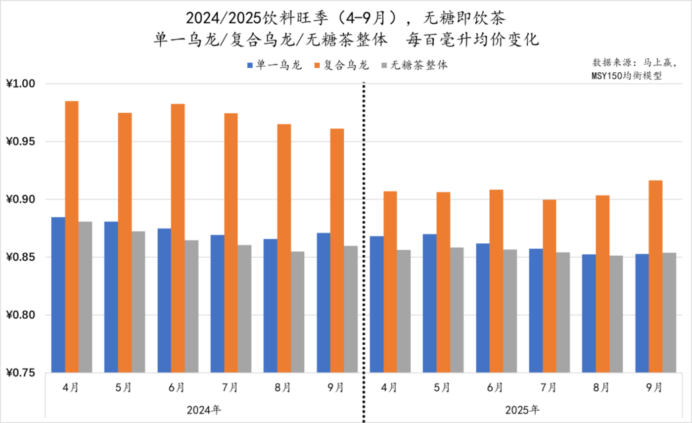 上文中,已经提及了部分无糖茶内乌龙茶种的占比、以及价格上的变化。整体来看,乌龙的占比在无糖茶类目中整体保持稳定,价格上则在 2025 年旺季相比 2024 年,有一定的件均价同比上升迹象。