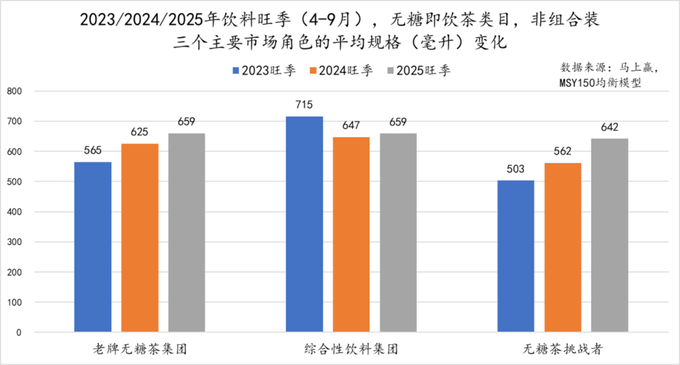 在规格上,三个角色在 2023-2025 年旺季表现出了不同的趋势,但在 2025 年旺季时已经趋于靠拢。其中,老牌无糖茶集团、无糖茶挑战者集团的平均规格有着较为明显的上升,体现出大规格化的趋势。品牌们正在通过进一步的规格细分,适应不同消费场景的需求。相比来说,综合性饮料集团的平均规格虽然在三者之间处于高位,但并未显著呈现上升趋势,2025 年旺季同比 2024 年仅有轻微增长。