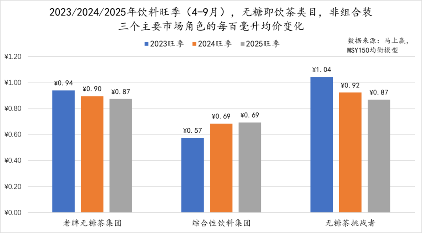 百毫升均价则呈现出了不同的表现情况:其中老牌无糖茶集团的百毫升均价整体平稳略有下跌,但依然显著高于综合性饮料集团,在 2025 年旺季与无糖茶挑战者已经基本持平;综合性饮料集团在 2024 年旺季同比 2023 年有显著的上涨,2025 年旺季与 2024 年同比基本保持一致;变化较大的依然是无糖茶挑战者下的几个集团,其百毫升均价自 2023 年旺季至 2025 年旺季均呈现明显的下探,从 2025 年旺季与 2023 年旺季相比,百毫升均价下降了近 20%。