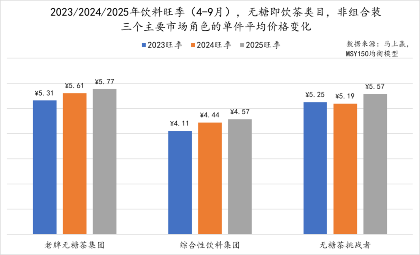 从 2023 年-2025 年饮料旺季 (4-9 月) 的三角色集团非组合装产品的单件平均价格来看,三者均整体上升,但不同集团存在明显区别。其中,老牌无糖茶集团的件均价逐年上涨,且在三角色集团的对比中始终保持相对高的水平;而综合性饮料集团的件均价是三角色中唯一低于 5 元的,虽然同样逐年上升但整体明显偏低。