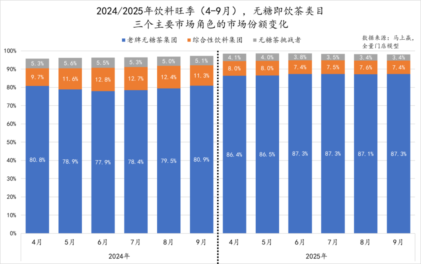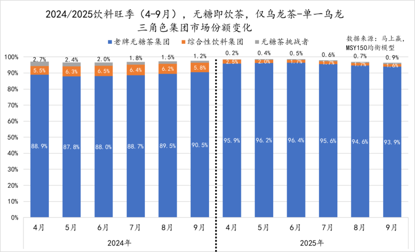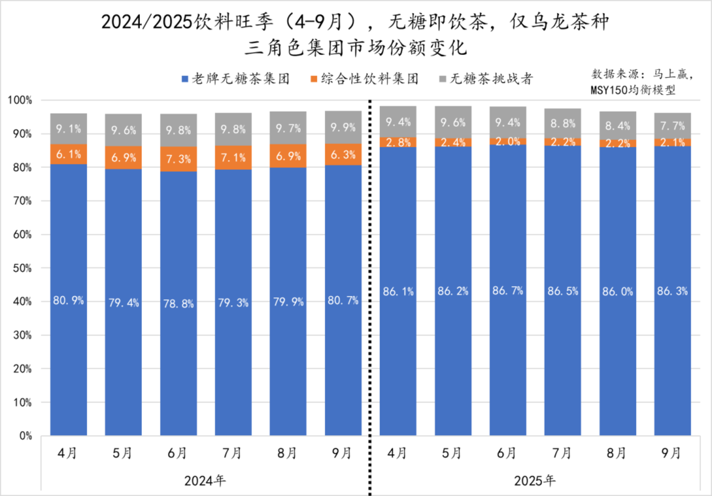 沿用上文三角色市场集团划分的方式对乌龙茶种的市场格局进行观察,可以看到,整体的茶种市场份额结构上与无糖茶类目整体的情况一致,依然是农夫山泉+三得利构成的老牌无糖茶集团占比超过 85%,且在 2025 年旺季,其市场份额相当的稳定。
