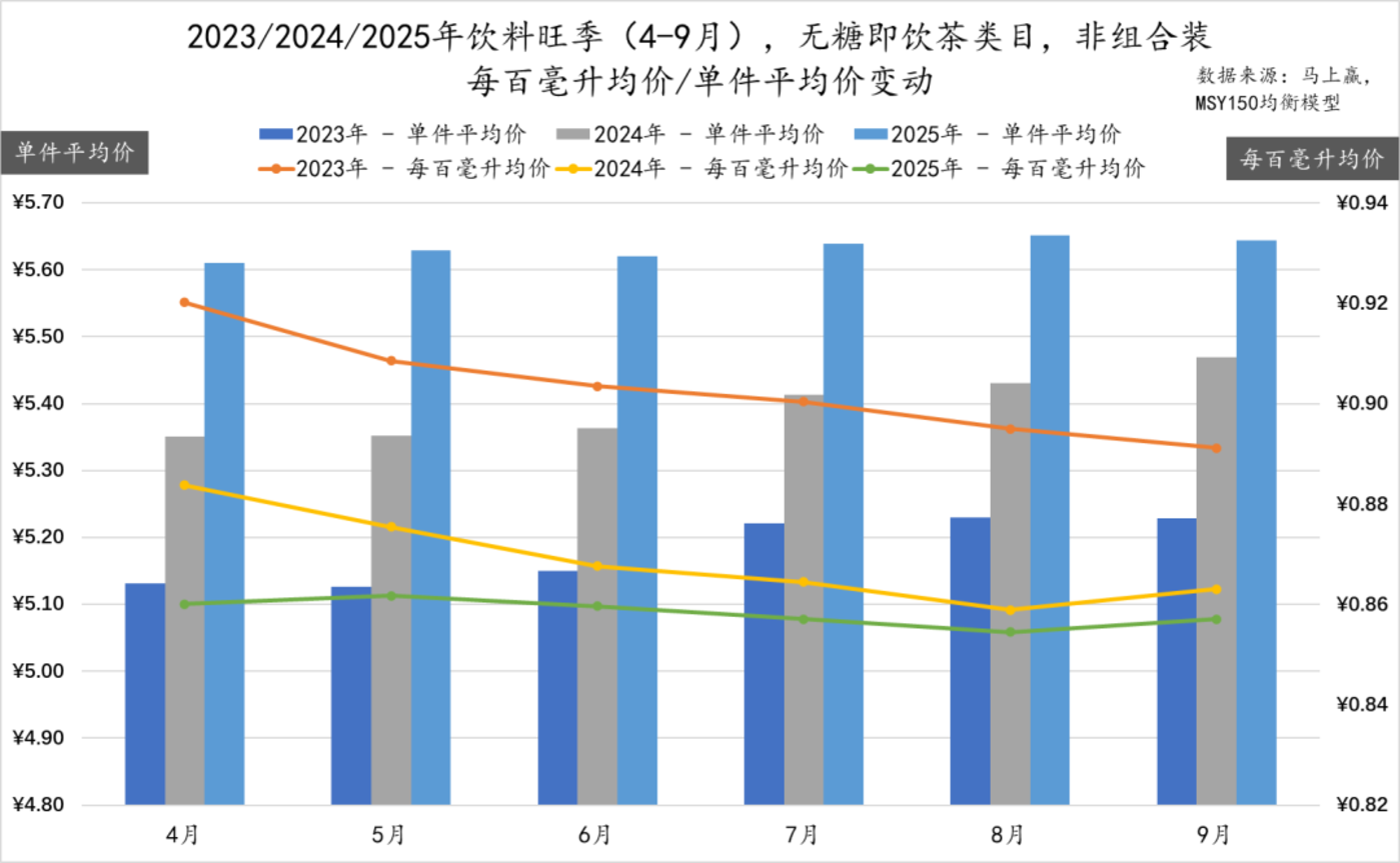 从百毫升均价上来看,2023/2024/2025 年旺季,无糖茶的百毫升均价整体呈现阶梯下降,但相比 2023-2024 年旺季,2024-2025 年旺季的百毫升下降幅度已经明显收窄。百毫升均价下降的原因,一方面来自价格竞争,另一方面或许也来自消费者购买的产品规格/容量不断变大,导致其单价不断降低。此外,一个可观的变化是,在 2025 年饮料旺季,百毫升均价的波动与下行趋势已经显著小于 2024/2023 年旺季,或也意味着在 2025 年的饮料旺季中,并没有发生太激烈的夏日价格大战——从简单的价格战中逃离,也是类目健康发展、逐渐成长与成熟的标志之一。