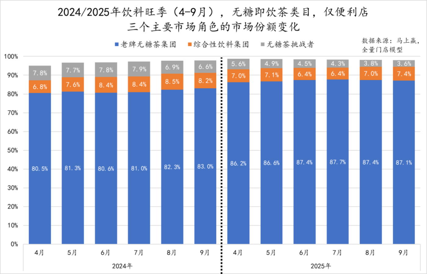 与此对应的则是渠道积累相对较薄弱、以便利店货架为核心起盘的无糖茶挑战者们,其在仅便利店业态中的市场份额,在 2025 年旺季开始的 4 月,还有 5.6%(整体 4.1%),但在 2025 旺季结束的 9 月,仅剩 3.6%(整体 3.4%)。