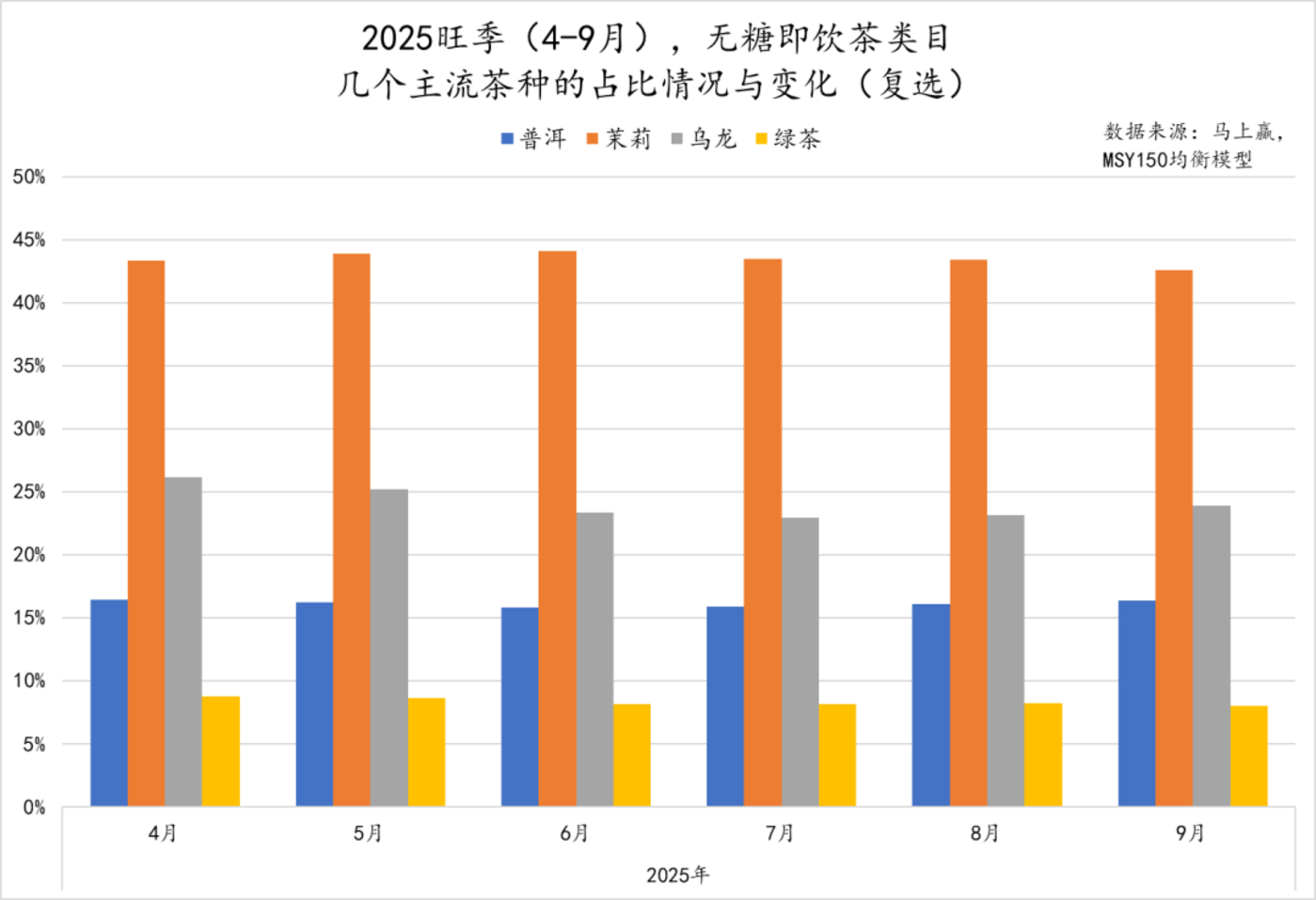 从茶种维度观察,不论是单一还是混搭,茉莉依然是占比第一的茶种,且在 2025 年旺季整体保持稳定;乌龙排名第二,在 6、7 月时占比稍有下行,但在 9 月又有所回升;排名第三的普洱、第五的绿茶基本占比稳定,波动较小。