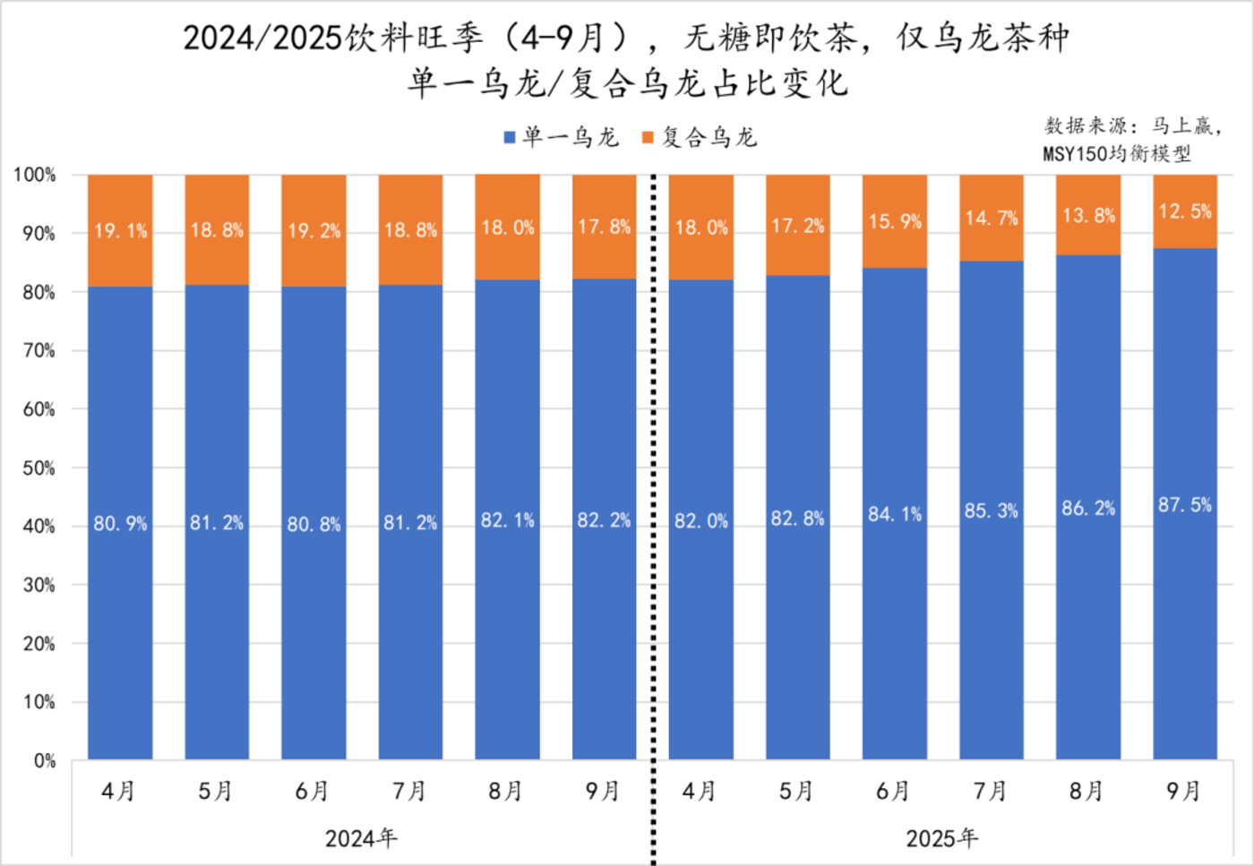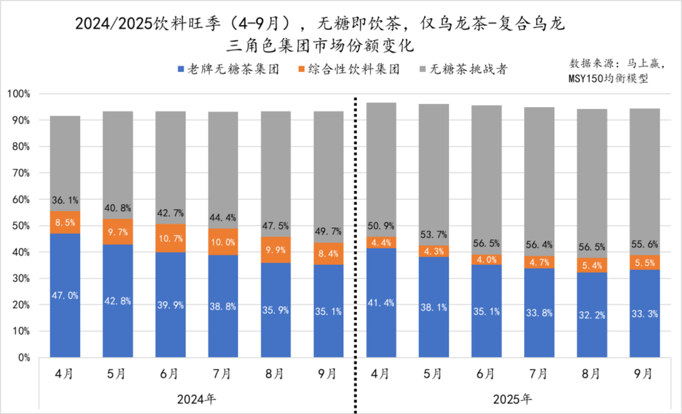 值得注意的是无糖茶挑战者在这一类型产品中的市场份额变化。在 2024 年旺季,无糖茶挑战者在复合乌龙中的市场份额接近 50%,2025 年则超过 50%、接近 60%,且在两个旺季周期内,都呈现出市场份额增长的态势。