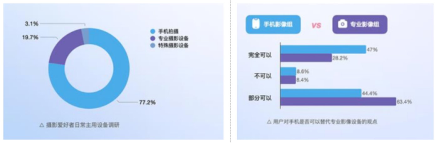 同时,据知乎研究院表明,无论是否拥有专业摄影设备,近 8 成的消费者均以手机为拍摄设备,而在专业设备和手机摄影的看法上,43.1% 的消费者完全认同影像手机的专业力。