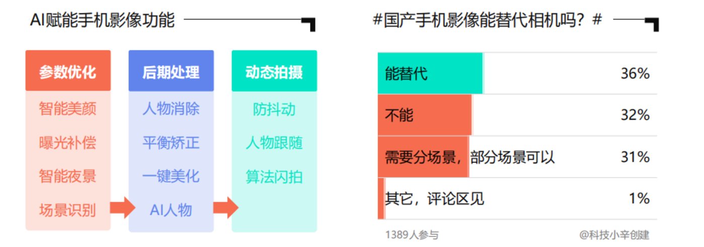 手机相机的专业化趋势和便携性,让优质照片的生产门槛变得更低,用户也不再只依赖专业相机。根据微博调研发现,随着国产手机成像技术的不段提高,有 36% 的用户认为手机能替代专业相机。同时手机摄影在借助 AI 技术的应用下,使拍照更简单方便,也能让照片在后期优化过程中更加智能。