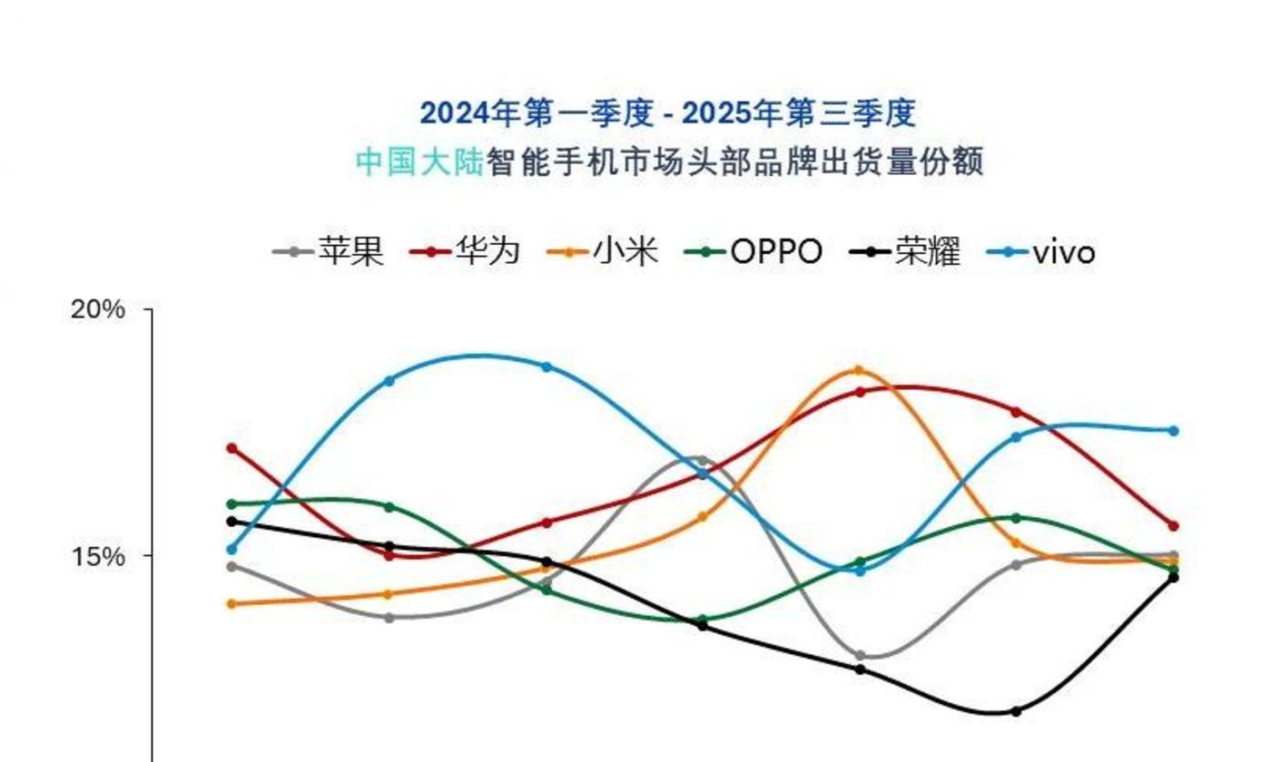 去年到今年,荣耀在销量方面就存在极大的挑战,IDC 数据显示,荣耀手机市场份额从 2024 年第一季度的 17.1% 的第一名,一路下滑至第四季度的 13.7%,排名第五,并在 2025 年第一季度跌出前五。而又据 Omdia 的最新研究显示,2025 年第三季度,在中国大陆智能手机市场头部品牌出货量份额统计中发现,荣耀仍是跌出前五的行列,被归集为 「其他」。