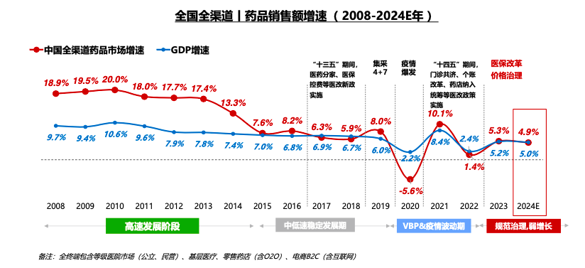 无论如何,医药行业的全面转型已经迫在眉睫。国家统计局数据显示,今年上半年全国医药制造业规模以上企业的工业增加值仅增长了 2%。另据中康产业研究院预测,今年全年药品全终端销售额增速预计降至 4.9%。