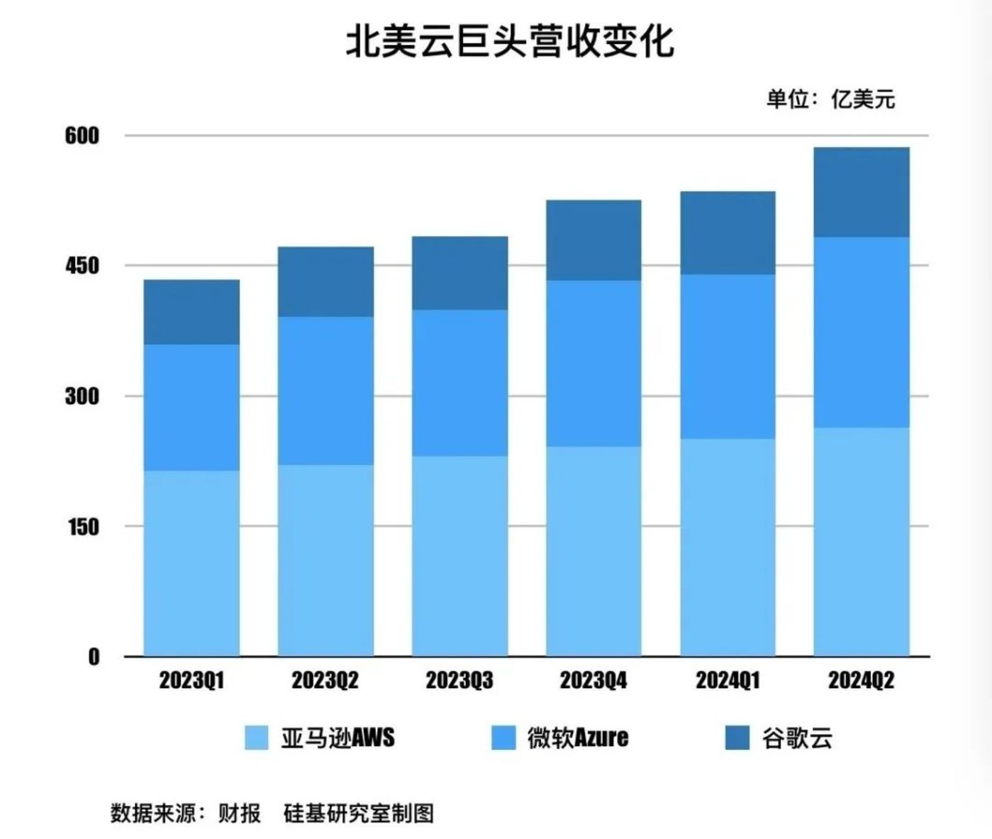 尽管在最新业绩中,北美云巨头们都提到 AI 正在带来看得见的增量收入,使用 AI 的客户数量大幅增加,但并不能抵消市场的质疑。机构 Synergy Research Group 的数据显示,亚马逊、微软和谷歌第二季度的资本支出超过了 480 亿美元,大部分的钱流向了基础设施的建设。