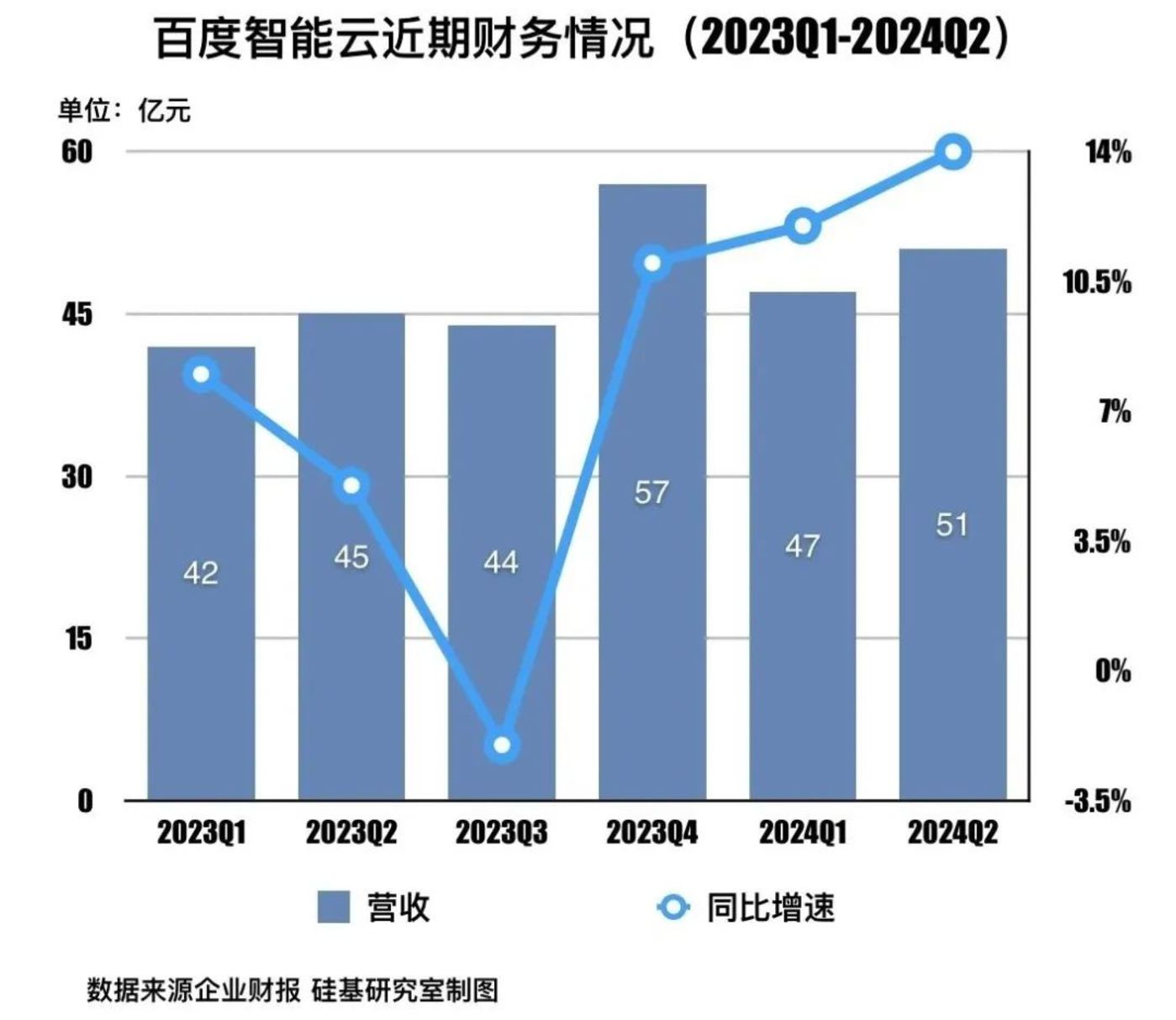 与阿里类似,智能云业务也被视为百度集团业务增长的 「第二引擎」,百度创始人李彦宏在 8 月 22 日的财报电话会透露,今年第二季度百度智能云收入同比增长 14% 至 51 亿元。拉长时间线来看,百度智能云单季营收同比增速已连续三季度维持双位数。