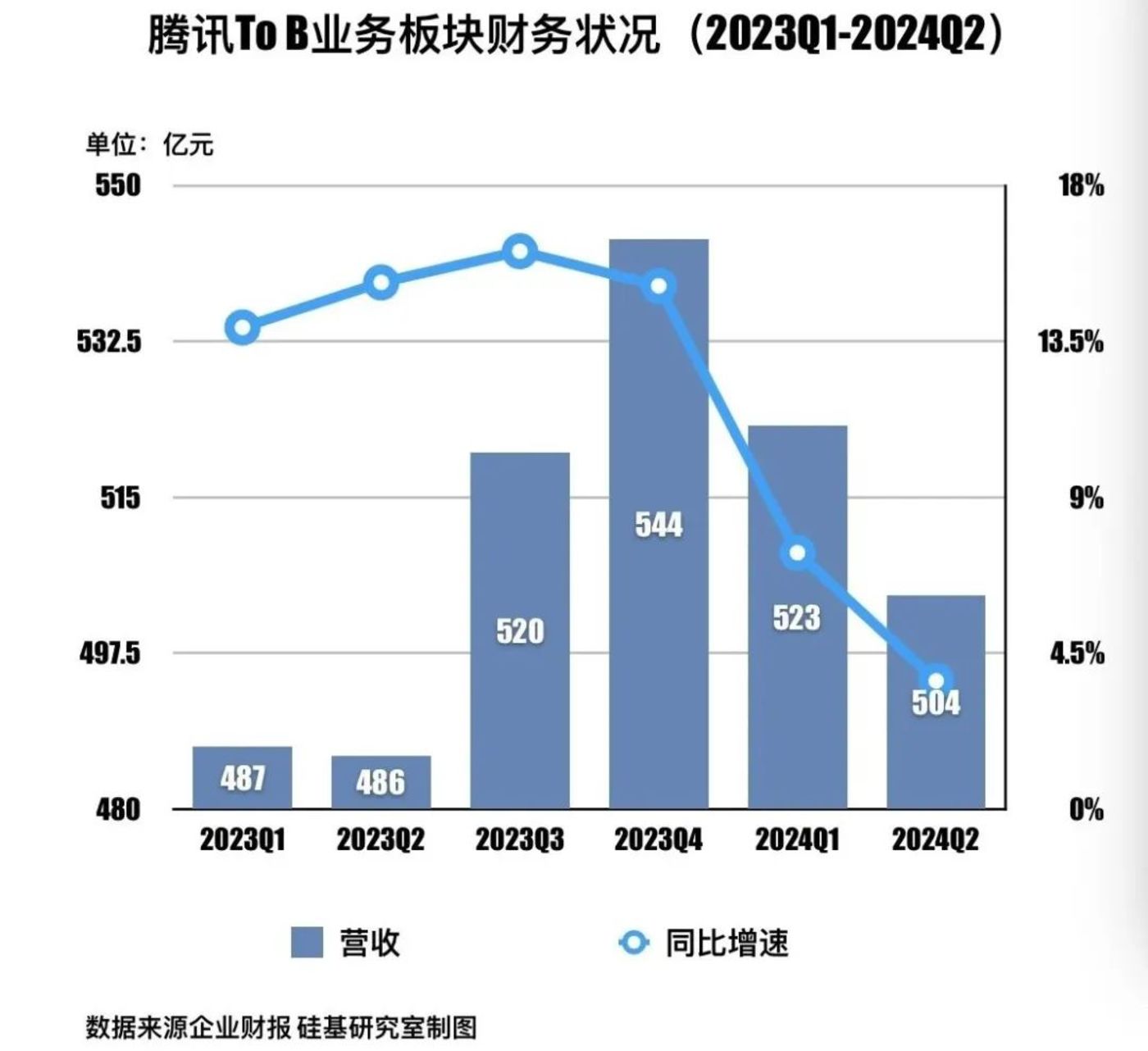 需要指出的是,从 2020 年开始,腾讯就不再单独披露腾讯云的收入,云业务所属腾讯的 To B 业务板块 (金融科技与企业服务),在本季度该板块业务实现收入 504 亿元,同比增长 4%,但与上一季度 7.4% 的增速相比,整体增速明显放缓。