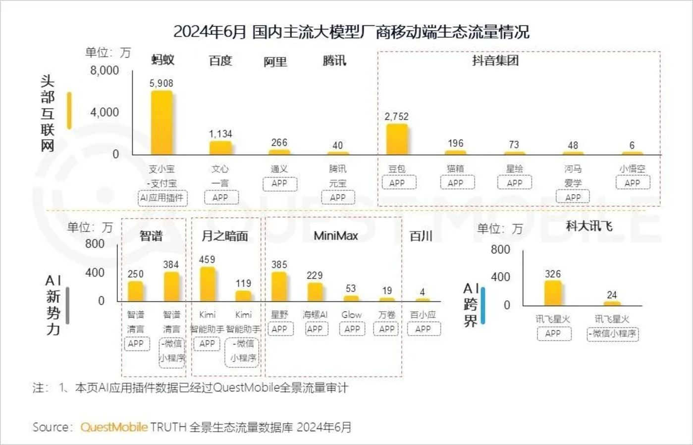据 QuestMobile 最新数据,今年 6 月,国内主流大模型厂商独立 App 用户流量破千万仅有 2 家,分别为字节跳动的豆包 (2752 万) 和百度的文心一言 (1134 万),腾讯元宝仅为 40 万。