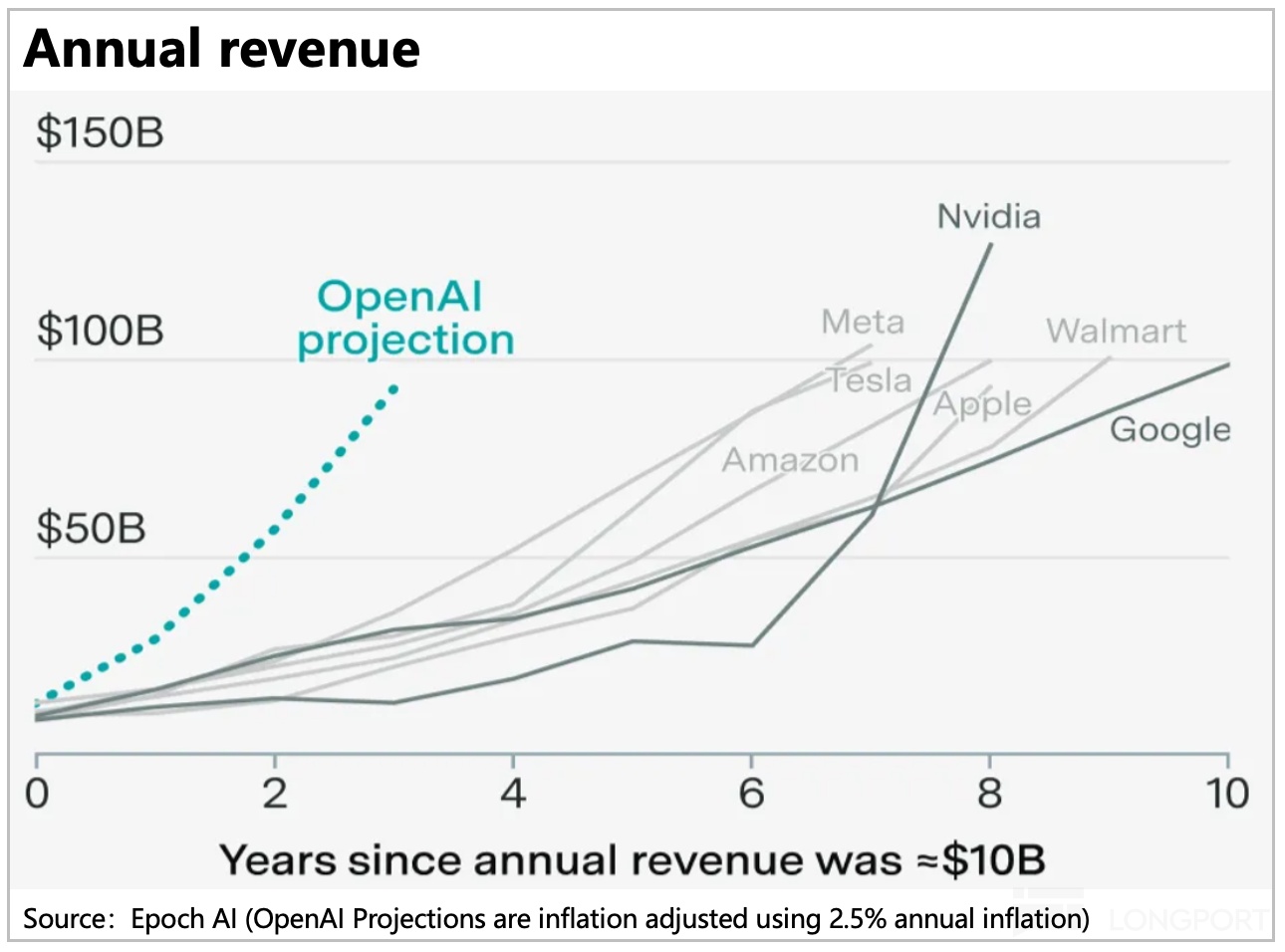 5 年 10 倍收入增长,而且是起点就已经在百亿级别,绝对是难度拉满。换种说法,5 年营收从 0 干到 1000 亿。放眼望去过去几十年,也只有在 AI GPU 领域做到 90% 以上绝对通吃且身处产业链中价值最高的芯片设计环节的英伟达,才有过这样的 “ 增长斜率”。