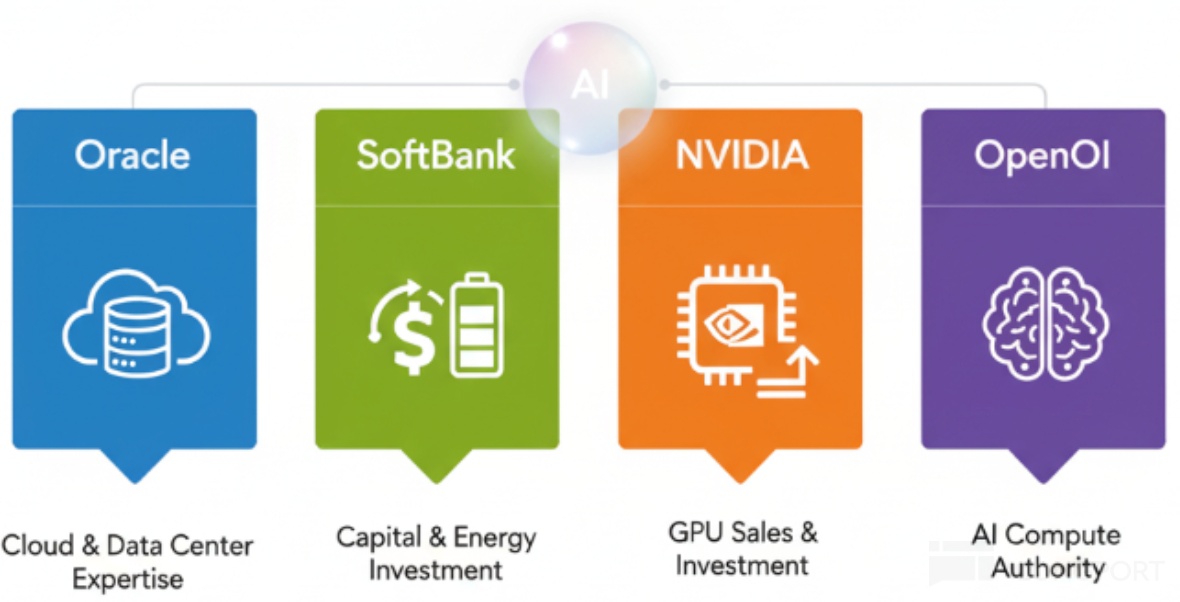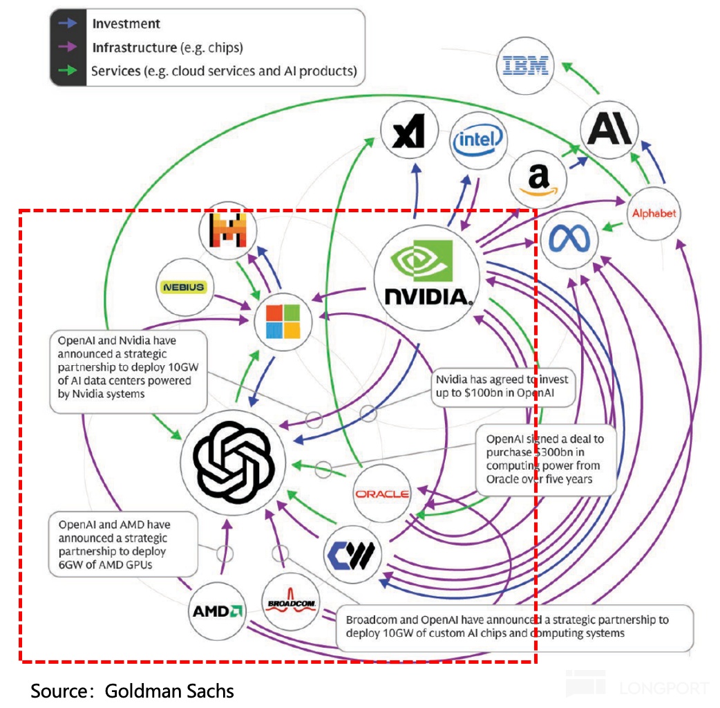 最复杂的合作生态,就是 OpenAI 的星际之门项目,它将 OpenAI 与 $甲骨文 (ORCL.US) 、$英伟达 (NVDA.US) 、$软银 (9984.JP) 等公司做了深度关联,被市场诟病的 “ 资金循环”、“ 算力重复叠加” 就在于此。