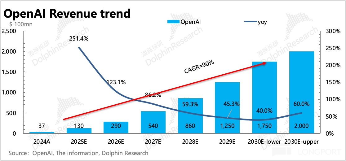 面对承付能力质疑,OpenAI 的商业化展望是这样的:2025 年预计营收 130 亿 (隐含下半年收入 87 亿,环比 100% 增长),2029 年目标 1250 亿,2030 年目标 1740-2000 亿,未来 5 年 CAGR 超过 90%。