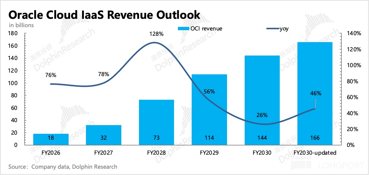 作为与 OpenAI 捆绑最深的一方,甲骨文也是赌上身家了。好的是,未来的收入增长几乎由 OpenAI 决定,OpenAI 也会尽可能把最多的算力需求订单给到它,比如 27 年开始的 5 年 3000 亿订单。这才有了 Q2 业绩会上 “ 炸裂” 的长期增长指引,以及 AI World 大会上的 “ 任性” 上调: