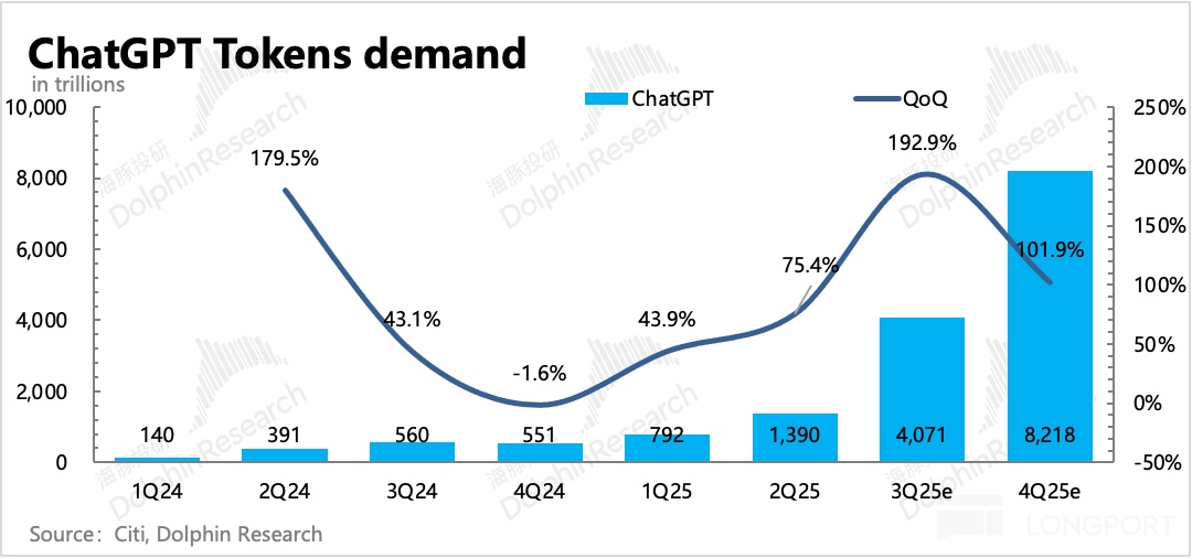 这 30GW 的算力负载,占到了美国 2024 全年数据中心总装机量的 60%。70% 利用率运行下,换算成 Tokens(按照 H100 GPU,7B-70B 不同大小的推理模型来算) 大约可以达到 10~378 万万亿/年,是 2025 年 OpenAI 14000 万亿 Tokens/年的 7~200 倍。