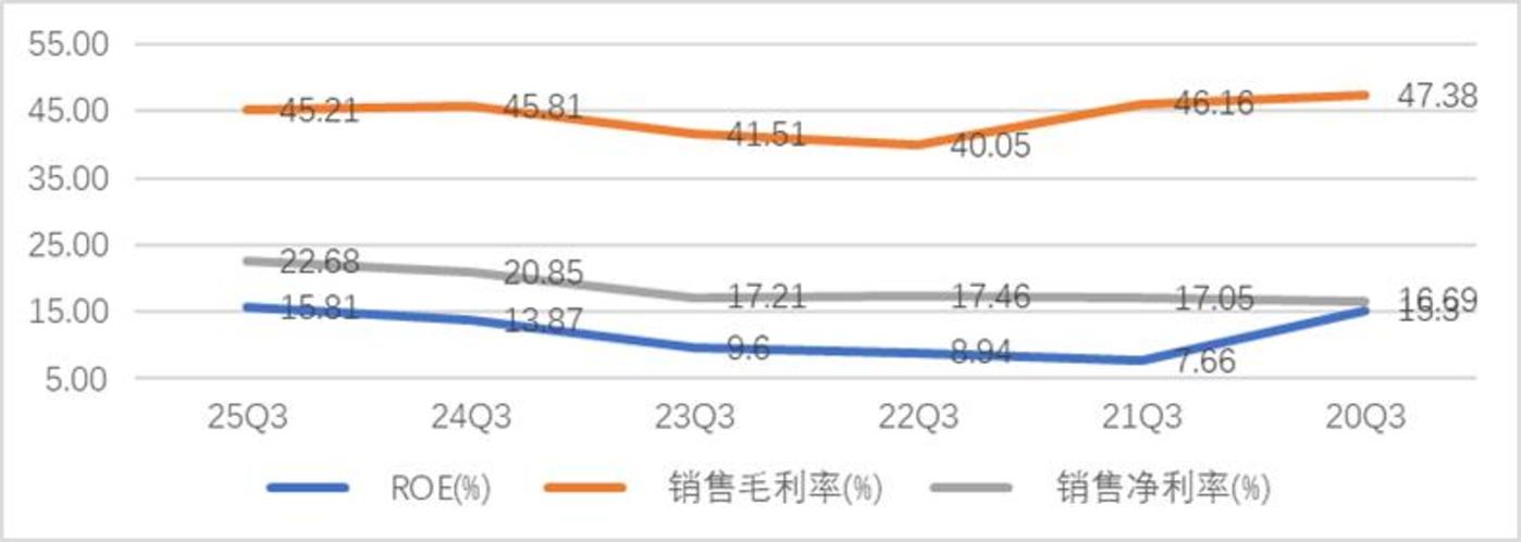 图:三季度单季 ROE、销售毛利率、销售净利率表现;来源:企业财报,锦缎研究院