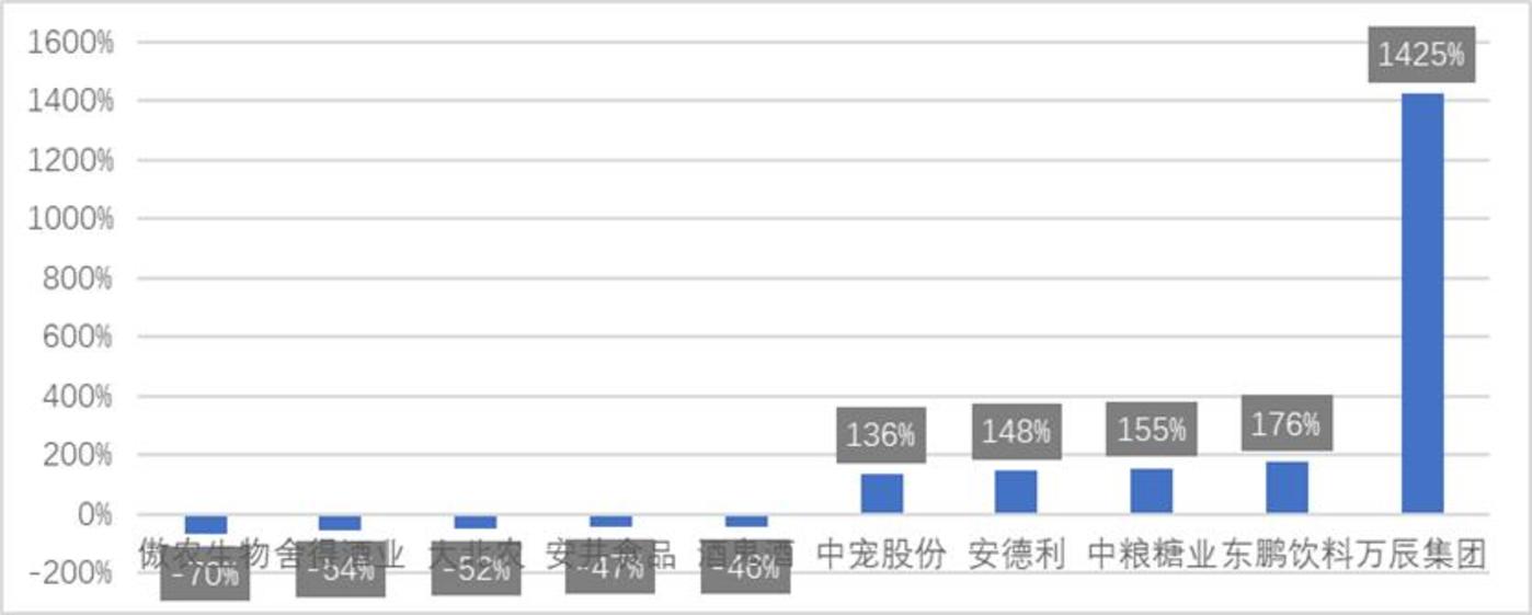 图:食品饮料行业近 3 年涨跌幅前五名;来源:企业财报,锦缎研究院