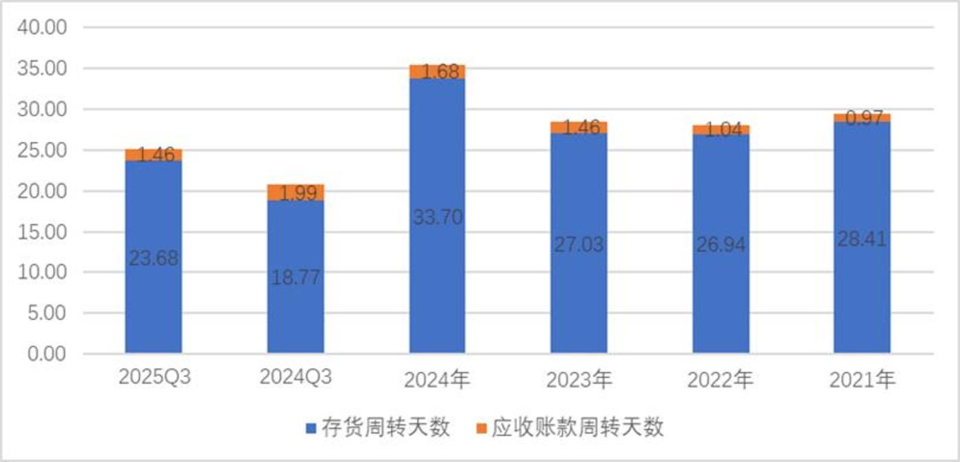 从营运周期来看,东鹏 24 年及 25 年前三季度均有所增长,但相比同业尚处于合理水平。24 年存货周转天数 33.7 天,应收账款周转天数 1.68 天,合计 35.38 天,与康师傅基本相当,优于农夫山泉 85.87 天。25 年前三季度营运周期 25.14 天,同比上升 4.37 天。