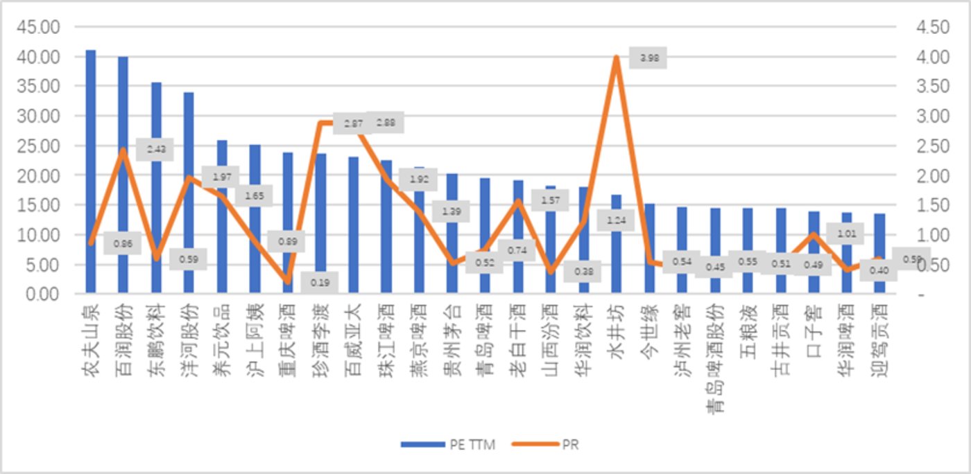 饮料行业 A 及 H 股上市公司 (剔除亏损的,剔除舍得酒业等 PE 奇高的)PE 大多介于 14 倍至 41 倍之间,PE 相对较低的是白酒股,如五粮液、茅台等,PE 在 30 倍以上的仅东鹏、洋河及农夫山泉,其中农夫山泉最高,为 40.97 倍。