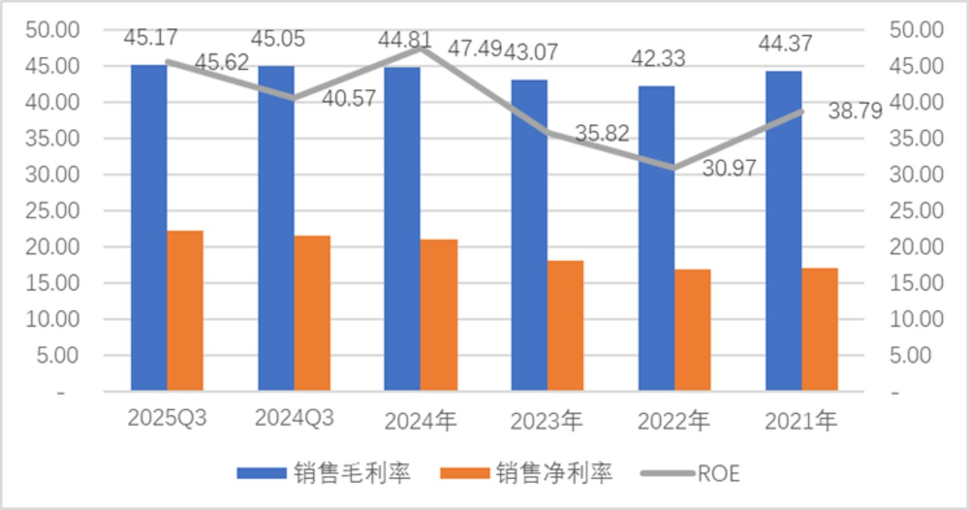 上市以来其销售毛利率稳定在 44% 左右,销售净利率稳中有升,24 年为 21%,或与规模效应分摊费用有关。21 年至 24 年 ROE 介于 38.79%-47.49%。