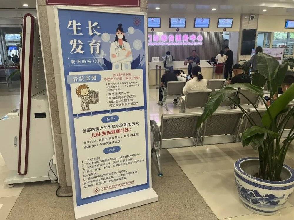 暑假期间,北京一家三甲医院候诊大厅挂出生长发育门诊的信息牌 (摄影/卢伊)