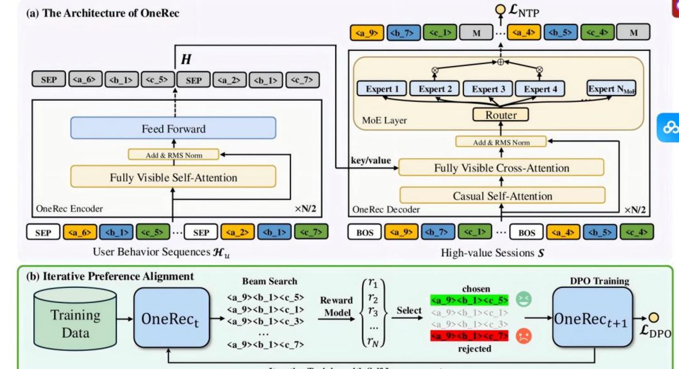 向内看,在搜推广的技术基建上,各家也都在探索大模型时代的推荐模型。UCSD 的 SASRec、Meta 的 HSTU、谷歌的 TIGER、快手的 OneRec、美团的 MTGR 和 UNM 等,这些模型都在不断优化结构,但也普遍面临如数据的不稳定性、推理延时高、存储与计算成本较高等挑战。