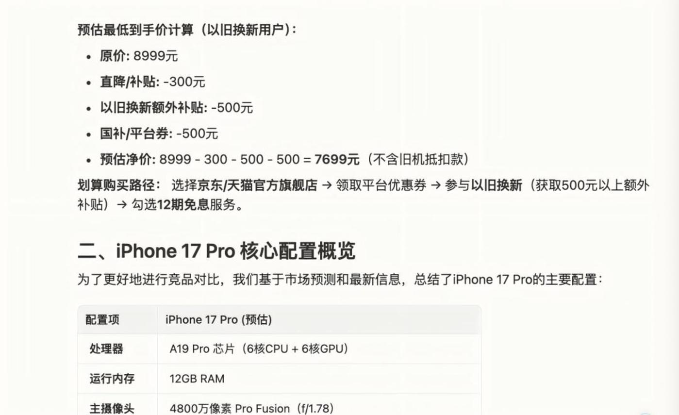 比如,迪迪就提到,Manus 给自己提供的优惠折扣并不准确:「7699 元就能买到 iPhone 17 Pro 的 256GB 版,这根本不可能」。她还提到,电商的折扣也随时都有变动,但 AI 攻略做不到实时动态调整。