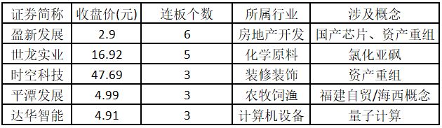 从连板情况来看,今日首板个股有 38 只;2 连板的个股有 6 只;3 连板及以上的个股有 6 只。今日连板数排名前 5 的个股包括盈新发展、世龙实业、时空科技、平潭发展、达华智能,具体如下表所示。