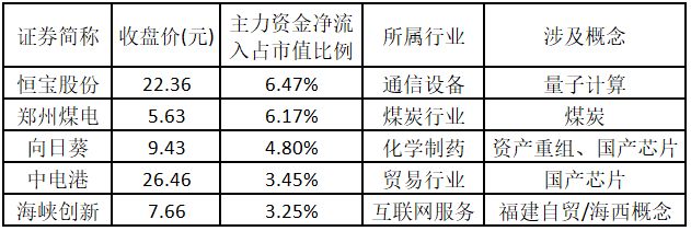主力资金净流入金额占市值比例排名前 5 的个股分别为恒宝股份、郑州煤电、向日葵、中电港、海峡创新。