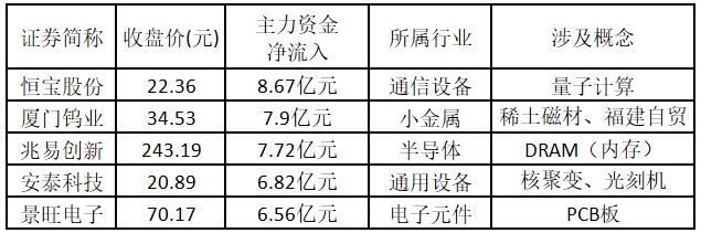 从主力资金来看,今日涨停板个股中,主力资金净流入金额排名前 5 的个股分别为恒宝股份、厦门钨业、兆易创新、安泰科技、景旺电子。