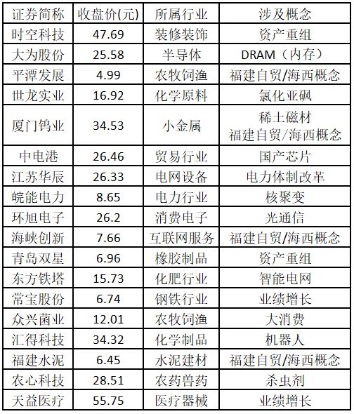 涨停板个股中,股价创出近一年新高的个股有 18 只 (不包括创出历史新高的个股),包括时空科技、大为股份、平潭发展、世龙实业、厦门钨业、中电港、江苏华辰、皖能电力、环旭电子、海峡创新、青岛双星、东方铁塔、常宝股份、众兴菌业、汇得科技、福建水泥、农心科技、天益医疗,具体如下表所示。