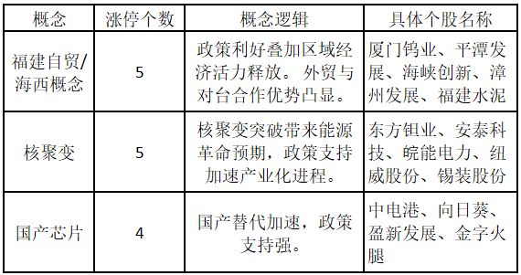 从概念特征来看,今日涨停板个股中,福建自贸/海西概念、核聚变、国产芯片概念的个股最多。