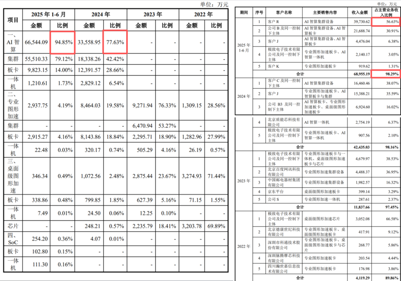 2024 年,摩尔线程 AI 智算业务从无到有,拔地而起贡献收入 3.36 亿元,占比 77.63%。今年上半年,AI 智算创造营收 6.65 亿元,占比进一步增加到 94.85%。