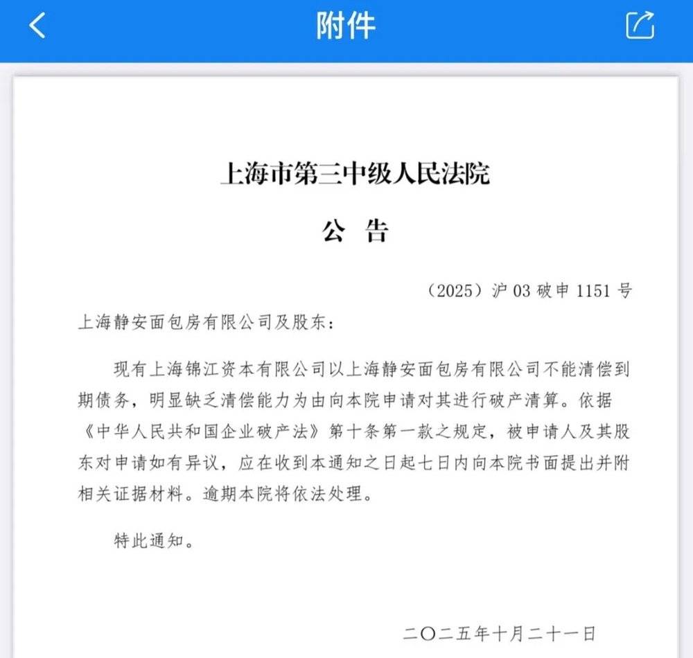 与此同时,上海市第三中级人民法院公告显示,其母公司上海锦江资本有限公司以静安面包房 「不能清偿到期债务,明显缺乏清偿能力」 为由,向法院申请破产清算,法院已于 2025 年 10 月 21 日启动法律程序。