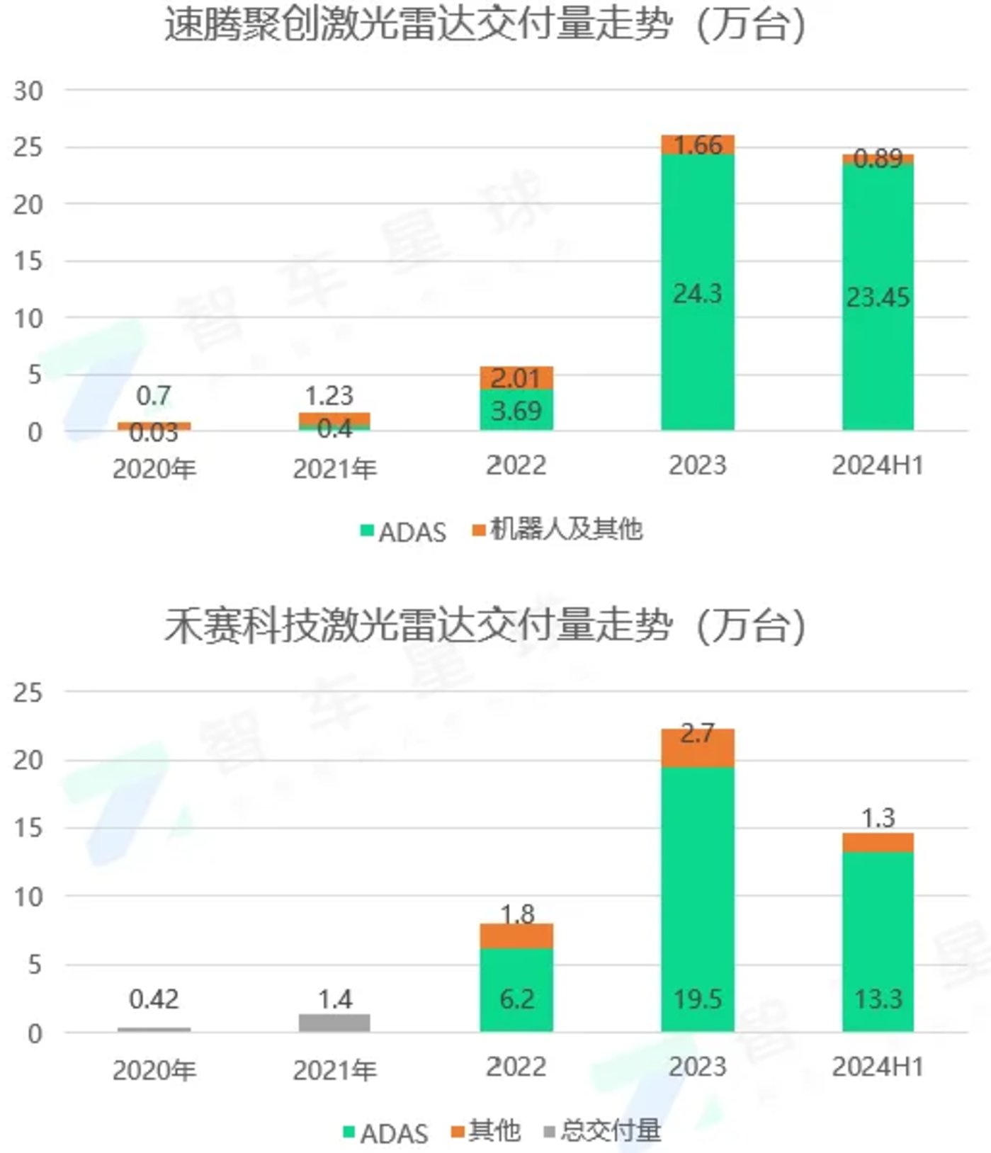 速腾方面,2024 年上半年激光雷达总销量约为 243,400 台,接近 2023 年全年销量,同比增长约 415.7%;其中应用于 ADAS 的激光雷达销量约为 234,500 台,同比增长约 487.7%;用于机器人的激光雷达销量 8,900 台,同比增长 21.9%。