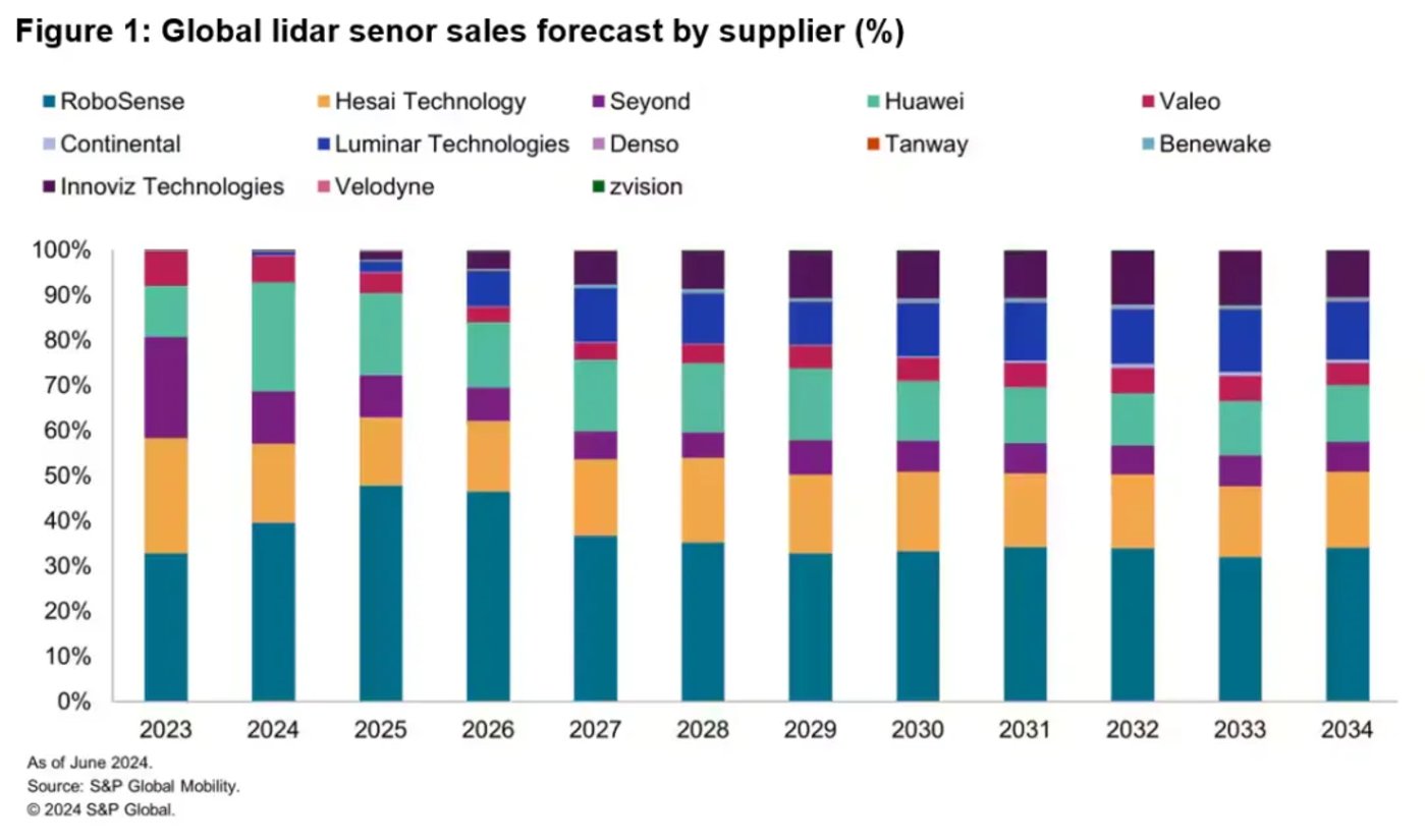 S&P Global 还预测,未来 10 年甚至更长一段时间,中国企业都将在全球激光雷达市场保持强势地位。而进入市场稳定期后,速腾将达到超 30% 的市场份额,禾赛则为 20% 左右。