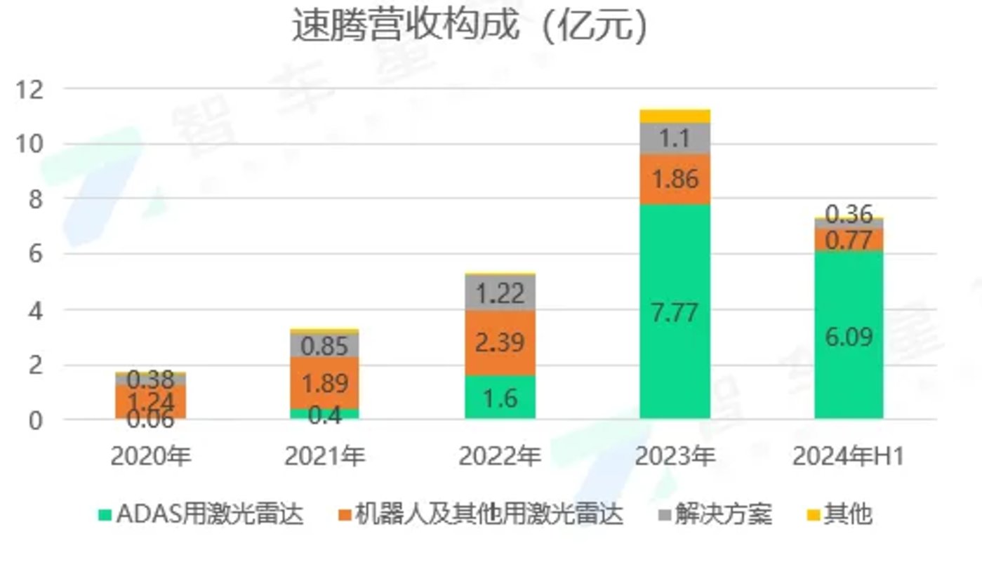 把营收拆分来看,2024H1 速腾用于 ADAS 应用的激光雷达产品收入约 6.1 亿元,比 2023 年同期的约 1.5 亿元大幅增长了 314.6%。