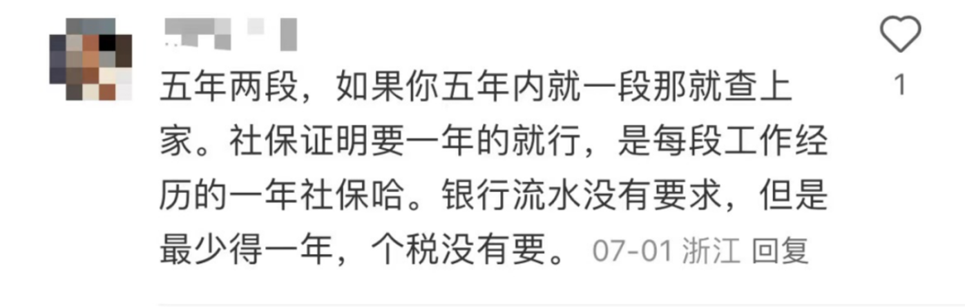 5 年两段,每段经历一年社保,至少提供一年银行流水…