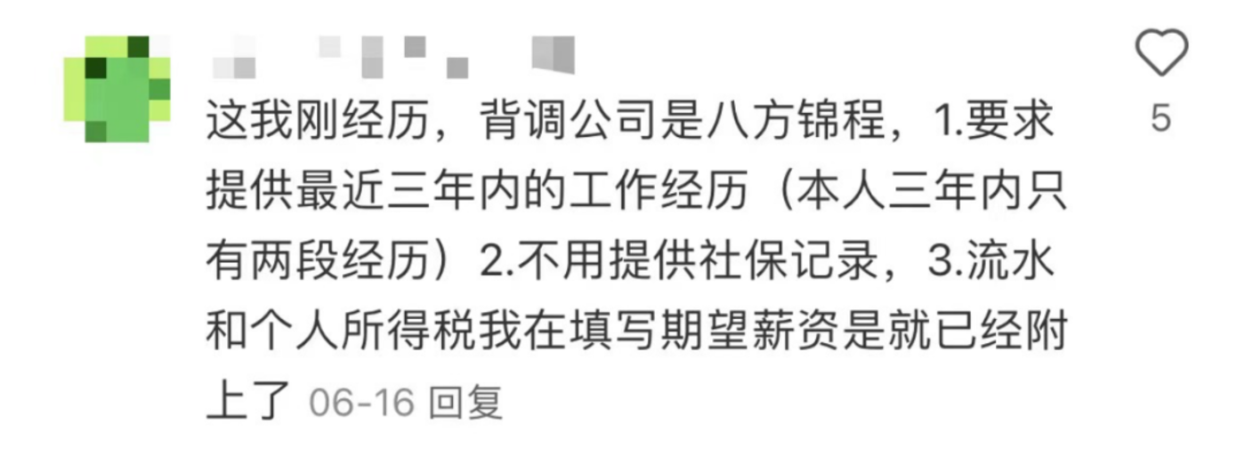 背调是委托三方机构八方锦程,只要求提供流水以及最近三年内的工作经历等。