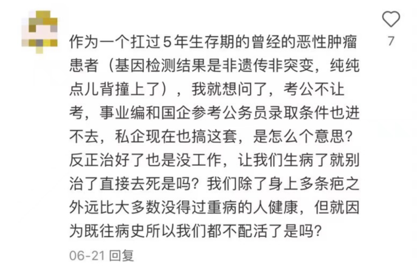 有的害怕自己的轻微焦虑症,会被留下案底了;有的焦虑,自己扛得过 5 年生存期的恶性肿瘤,却扛不过背调。
