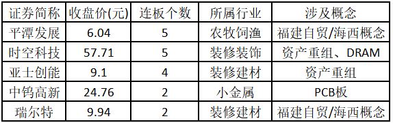 从连板情况来看,今日首板个股有 49 只;2 连板的个股有 8 只;3 连板及以上的个股有 3 只。今日连板数排名前 5 的个股包括平潭发展、时空科技、亚士创能、中钨高新、瑞尔特,具体如下表所示。