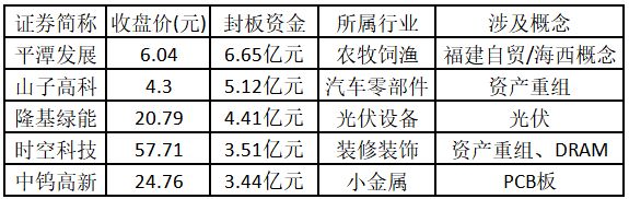 从封板资金来看,今日涨停板个股中,封板资金排名前 5 的个股包括平潭发展、山子高科、隆基绿能、时空科技、中钨高新。欢迎大家关注微信公众号 「道达号」,其 「道达涨停复盘」 栏目为大家解读。